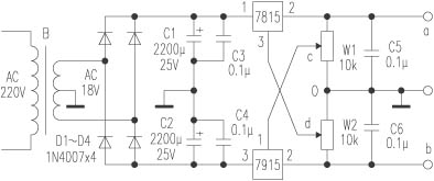 电路如附图所示,由变压器输出的交流双18V电压经D1~D4整流,C1、C2滤波得到一直流电压,其中变压器双电源的中心抽头作为公共接地端,然后分别把该直流电压正负极接入7815的①脚和7915的③脚。7815的③脚接到电位器W2的滑动触片“d”上,7915的①脚接到电位器W1的滑动触片“C”上。当将触片“C”滑到“0”端接地时,调节W2,即可从“a”端得到“+6~+15V”的正向可变电压;若将触片“d”滑到“0”端接地,调节W1,在“b”端就可得到“-6~-15V”的负向可变电压,将W1、W2换成同轴电位器,将获得正负对称的可调电源,输出电压值在±6V~±15V之间连续可调,可达到同步调节的目的。