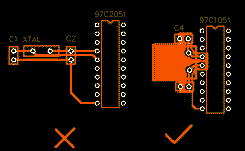 (3)注意晶振布线,见图8。晶振与单片机引脚尽量靠近,用地线把时钟区隔离起来,晶振外壳接地并固定。此措施可解决许多疑难问题。