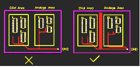 (5)用地线把数字区与模拟区隔离,数字地与模拟地要分离,最后接于电源地,见图10。A/D、D/A芯片布线也以此为原则,厂家分配A/D、D/A芯片引脚排列时已考虑此要求。