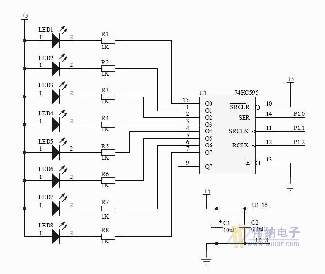 74HC595具有一个8位串行输入并行输出的移位寄存器和一个8位输出锁存器。 应用电路图: