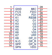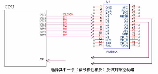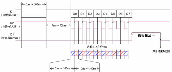 (2)并行地址接口: 在并行地址接口工作方式下,K1为同步时钟端,K2~K8为7位并行地址输入端,最大可分为27=128段。O1、O2位两种极性相反的忙信号输出,可由用户选择使用其中一条输出。作为忙信号,O1在播放语音时为高,放音完毕拉低;O2与其正好相反。 并行地址接口工作方式的电路如图5,工作时序如图6。 ![]() 图5 并行地址接口工作方式电路 ![]() 图6 并行地址接口工作方式时序图 (三)RESET时序 用单片机口线控制PM60的复位时,需要注意给完RESET管脚低信号后需要延迟300ms的时间,才能开始PM60的放音操作。放音操作,否则不能正常复位。 ![]() 图七 PM60的RESET时序 7. PM60的编程软件 PM60的编程软件的使用环境继承了PM50编程软件的风格,与PM50编程软件中“智能2代”工作方式类似,详细的使用方法请参阅PM50编程软件中“智能2代”部分的内容。其中略有改动的是,加入了“record”的设置以配合PM60可以接MIC录音的新功能。 8. PM60的MIC录音方式 PM60相对于PM50,除了在录音时间上有所增加,而且增加了MIC录音的功能。使PM60芯片的使用更具有灵活性。需要PM60的MIC录音功能时,在下图中所示的下拉菜单中选择对应选项。 ![]() PM60的录音需要在编程软件上预先设置好录音存储的位置,如果采用按键操作模式,则选择存储在K1~K8端;如果采用微控制器操作模式,则选择存储在对应的地址。两种设置方式如下图所示: