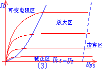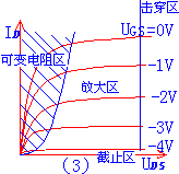 输出特性曲线:(如图(3)所示) 根据工作特性我们把它分为四个区域,即:可变电阻区、放大区、击穿区、截止区。 对此不作很深的要求,只要求我们看到输出特性曲线能判断是什麽类型的管子即可