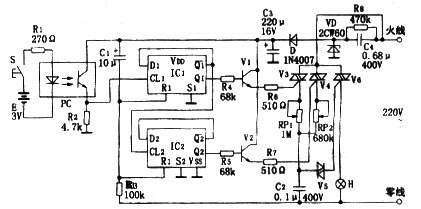IC1、IC2选用CMOS双D触发器CD4013。PC选用4N25光电耦合器。V1、V2选用9013型NPN硅晶体管,β>80。V3、V4选用1A/400V双向可控硅MAC94A4。V6是选用3A/400双向可控硅TLC226。V5选用ZCTS型双向触发二极管。C4选用CBB-400V型聚苯电容器。H选用220V/60W白炽灯泡。S选用小型轻触按键开磁。电源E选用2节1.5V的5号电池。RP1、RP2选用WH7型微调电位器。其余元件参数如图所标注。