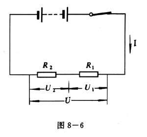 如图8-6,设串联电阻的阻值为R1.R2,串联后的总电阻为R,由于通过整个电路的电流都是I,根据欧姆定律.我们有: